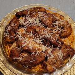 Layer a ladle of sauce, freshly grated parmesan cheese, and thick slices of fresh mozzarella onto the chicken. Broil until the cheese is melted and golden, then serve the remaining sauce with spaghetti and enjoy!