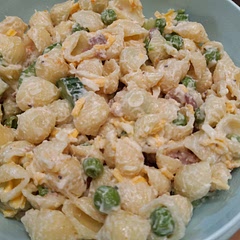 Pea Pasta salad recipe with bacon and Ranch Seasoning. A simple potluck salad, this pea and mini shells pasta is the creamiest side salad EVER! Not just covered in mayo, the tangy spices of ranch combined with the bursting flavors of bacon and cheese make this a pasta salad perfect for a BBQ. Peas and pasta are a classic and often referred to, old fashioned side dish that goes amazing with summer time BBQs and potlucks. An easy, flavorful and fun side, this colorful pea pasta salad includes the perfect pea, mini pasta shells, bacon, cheese and creamy homemade dressing. Sure to be one of your favorite spring and summer dishes of all time, this perfect pairing of filling pasta and fresh peas is incredibly delightful. Plus, pea pasta salad also makes delicious left overs for lunch the next day! Make this side dish a day ahead or the day of, as long as its served cold, this Southern Spring salad will be gone in an instant!