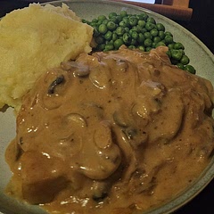 Juicy pork shoulder steaks in a creamy sauce with mushrooms and onions. A 25 minute one-pan meal - great for a weeknight dinner.