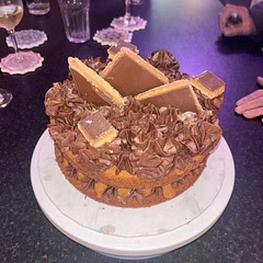 A three-layer caramel sponge millionaires cake with chocolate buttercream frosting, gooey caramel, and mini shortbread bites!