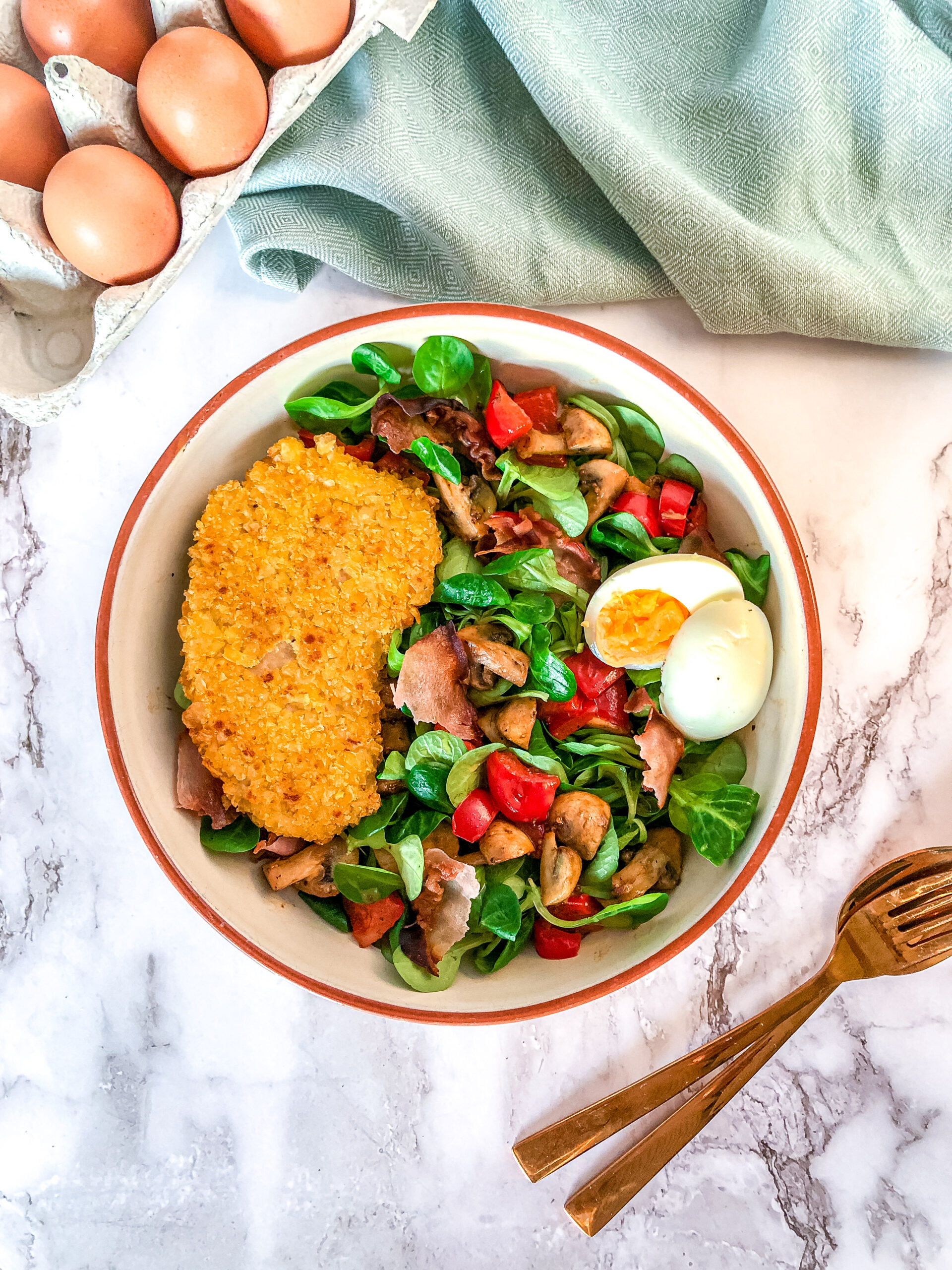 A good salad to combine with greasy food like fries! I always make this salad when I want to eat fries, but I still want to keep it a bit healthy. This way, you still have your fries and crispy chicken, but also your veggies! A good way to compensate right?!