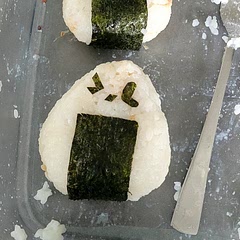 Spread the rice on one hand, creating a dip in the middle. Add the tunamayo to the dip and cover with some more rice. Shape in a triangle (or a circle, as you prefer). Use the nori sheet to cover the base of it, just like in the emoji 🍙