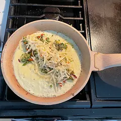 Thin sliced red onion 2 tbsp, add to pan of tsp hot butter. Turn heat down, add 2 tbsp red bell pepper, 1 tbsp jalapeno, heat until glassy. Add 1 cup shredded zucchini and heat on low until softened and some browning occurs. Remove veggies from pan and set aside. Shred cheeses and set aside. Beat one egg and 1/4 cup of egg whites until smooth (no lumps). Heat 1 tbsp butter in same pan until bubbles. Turn heat to low and add beaten eggs. Place lid on pan. Closely watch eggs cook and give pan gentle shake to evenly distribute eggs to cook. Once top becomes slightly cooked, add veggies and cheese on top and quickly cover. Watch closely and lift pan from heat as cheese melts. Take spatula and gently lift around all edges until you can peel one side easily to fold it over. Fold other side, place lid on, turn heat off. And plate. Add chives or parsley to top.