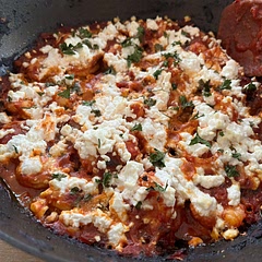 Sprinkle crumbled feta over mixture and bake in oven for 10. Sprinkle with parsley and serve with bread.