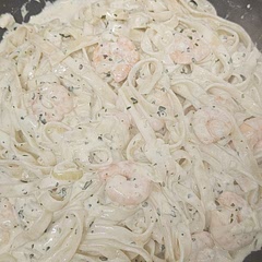 Stir 2-3 tbsp of the pasta water and the parsley into the sauce.