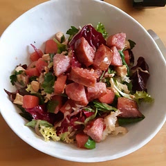 4. Arrangez une moitié des feuilles de salade dans un saladier, parsemez l'oignon émincé, les herbes et les tiges de ciboule ciselées, puis le reste des feuilles de salade. Ajoutez les dés de pastèque, les baies de cassis, la mozzarella, les feuilles de menthe. Présentez la vinaigrette à part.