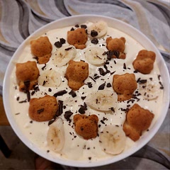For the top of the pudding, decorate as desired with the Miffy nilla wafers, sliced bananas and mint leaves.