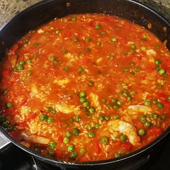 Влейте бульон и томаты, готовьте до полуготовности риса.