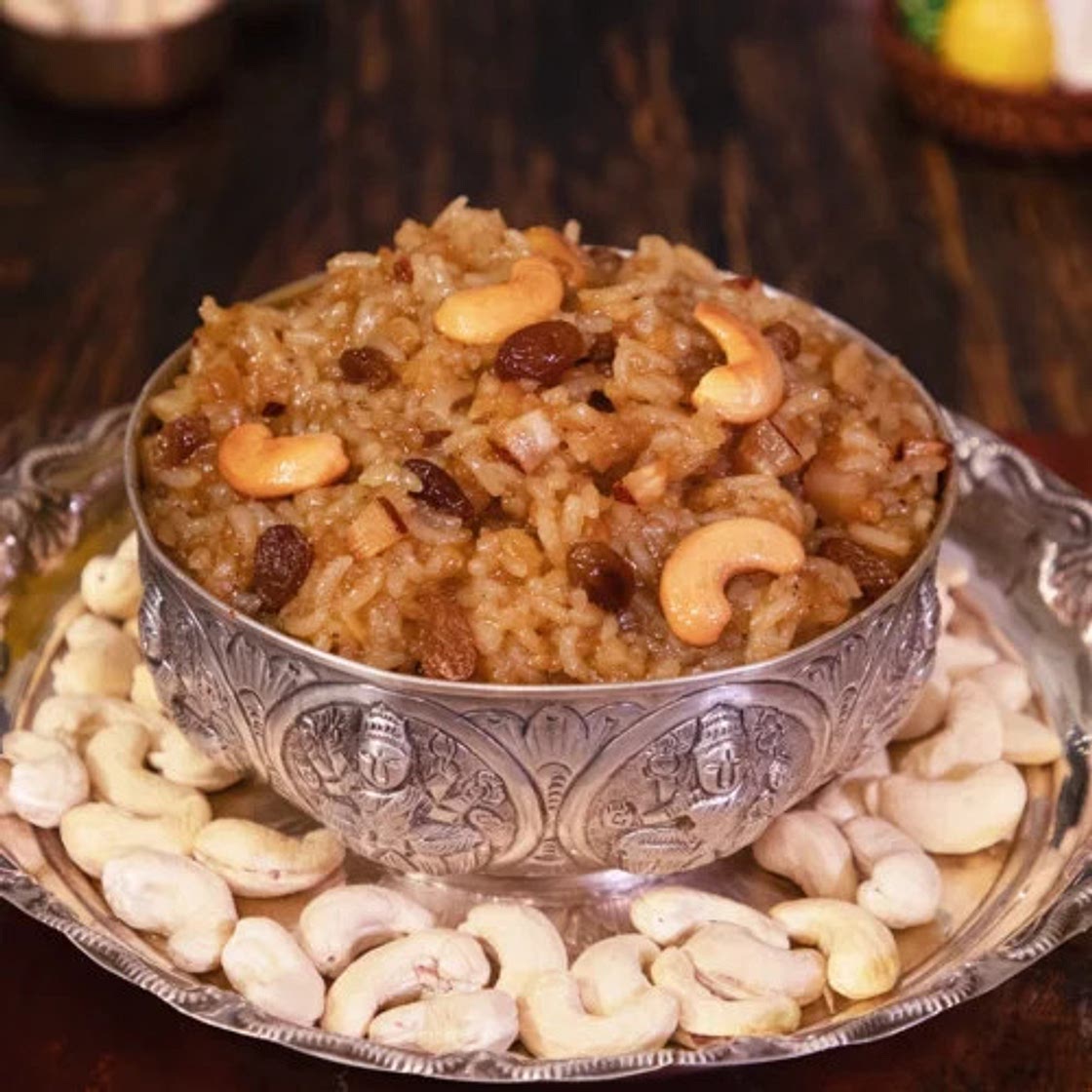 Sweet Pongal (Sakkarai Pongal/Chakkarai Pongal) is a traditional South Indian dish made during festivals like Pongal and Makar Sankranti. It’s a rich, comforting dessert prepared by cooking rice and moong dal together, then sweetened with jaggery and flavored with ghee, cardamom, and a generous topping of cashews and raisins. This warm, aromatic dish symbolizes prosperity and is often offered as prasadam in temples.
