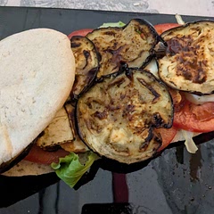 Spalmare l' aioli sulle fette di pane, aggiungere l'insalata, il pomodoro, le melanzane e il formaggio. Irrorare con la glassa al balsamico e coprire col resto del pane