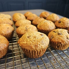 Preheat over to 350 F. Mix flour, sugar, baking powder, baking soda and salt. Add eggs, oil, and bananas. Add choc chips. Spoon into greased muffin tins (fill each about 2/3 full). Bake for 20 minutes