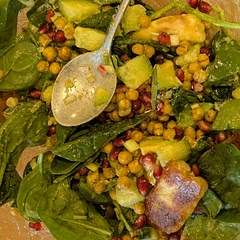 METHOD: 1. Cover the chickpeas in the sweet paprika & garlic powder, add sea salt to taste. Toss until well covered & bake in the oven or air fryer for 15mins on 200°C 2. Fry the halloumi in a heated non-stick pan until slightly brown, then pour in the honey & sprinkle on the chilli flakes. Fry until a little more golden & crispy. Use medium to high heat! 3. Mix the salad ingredients together. Add the cooled down chickpeas & halloumi, pour the dressing over, mix well &