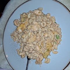 While pasta is boiling, in a large saucepan melt the butter, add cubed chicken and onions. Sautee and add all the spices. Cover and let simmer for a few minutes.