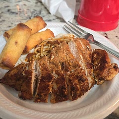 plated on a bed of basmati rice. served with sides of kimchi and sauce