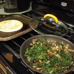 In a large skillet add 1/4 cup olive oil on high heat, add in the julienne onions until they are light brown and caramelized. Top the prepared kale dish. Enjoy just like that or with pita bread!