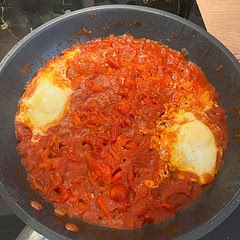 Tip : Keep in mind eggs will continue to cook from carryover heat. Remove the pan from the heat before they reach the stage you prefer. If you want to add Minced Meat / Sausage to your Shahshuka, add it first along oil and garlic. Cook for 7 - 10 mins then add the rest of the ingredients as shown.
