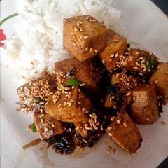 Transfer tofu to a large plate, spoon sauce over, and sprinkle with sesame seeds and reserved scallion top. Serve with rice alongside.