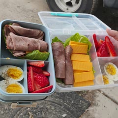 Arrange all ingredients in a sectioned lunch container or on a plate.