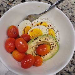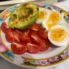 Top each bowl with 1 cup tomatoes and half of the avocado.