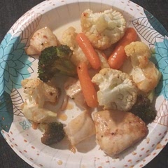 Line a sheet pan with aluminum foil for easier cleanup and to it add the chicken, vegetables, evenly drizzle with olive oil, season with pepper, evenly drizzle with 3/4 of the chili sauce, toss with your hands to combine, and roast for about 14-15 minutes, or until chicken is cooked through and vegetables are crisp-tender. If baking in a conventional oven, you may need to bake slightly longer, 17-18 minutes, but watch your food and not the clock.