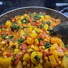 Season and add the potatoes and chickpeas along with 1⁄2 a tin of water and simmer for 30 minutes until thickened and the potatoes have cooked through. Add the spinach and cook for a few minutes to wilt.