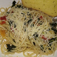 Carefully add the boiling water to the pan with the spaghetti. Cover pan, and bring up to a boil. Remove lid and simmer for about 6 minutes, using tongs to move the spaghetti around now and then so it doesn’t stick. Add kale or spinach and continue cooking until remaining liquid has reduced to a sauce and the pasta is cooked through. Taste, season with salt and pepper, and top with Parmesan.