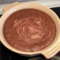 Blanda mjöl, kakao, vaniljsocker och salt och rör ner i äggsmeten.