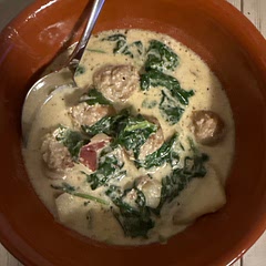 Tuscan Soup is a simple mixture of Italian sausage, potatoes, evaporated milk and lots of spice. Add spinach or kale at the end for extra veggies.
