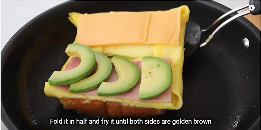 Put ham slices on left side with avocado slices on top. Put cheese slices on the right side. Fold in half and fry it until both sides are golden brown.