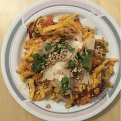 Une fois les spätzli cuits, mettre la crème et le pesto maison dans la poêle. Assaisonner