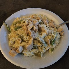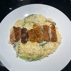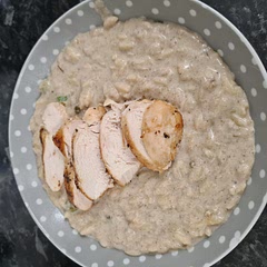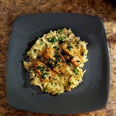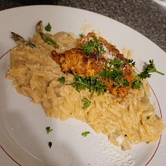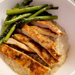 Add the asparagus back and stir it in. Slice the chicken into thin slices. You can either add it to the skillet and stir it in, or as seen in the photos, arrange over the orzo.