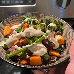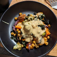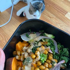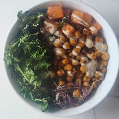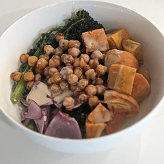 To serve: slice sweet potatoes into bite size pieces. Divide vegetables between 3 serving bowls and top with chickpeas + tahini sauce.