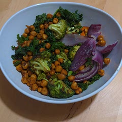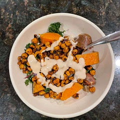 While vegetables are roasting, heat a large skillet over medium heat and add chickpeas to a mixing bowl and toss with seasonings.