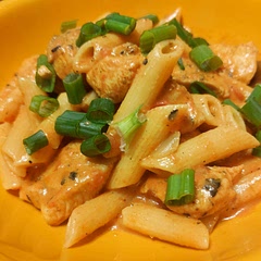 Add the cream cheese to the skillet in chunks, then stir until it has melted into the sauce. Top the pasta with sliced green onions and serve.