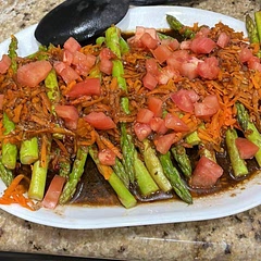 Add asparagus and carrot to skillet. Cook and stir for 3 to 4 minutes or until asparagus is crisp-tender; transfer to serving platter.
