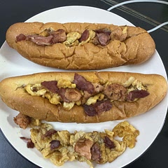 If the technique is mastered correctly. The eggs should now have a soft breadcrumb consistency. Add egg crumble to a bowl. And add bacon aswell. Mix it up and then fill up your buns. I would recommend toasting the hotdog buns. When filled, season with black pepper to your liking.