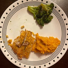 Cheddar-Crusted Chicken with Buttery Mashed Sweet Potatoes and Roasted Broccoli