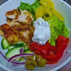 In a large plastic zip bag, combine olive oil, garlic, lemon juice, red wine vinegar, oregano, greek yogurts and salt and pepper. Massage to mix.